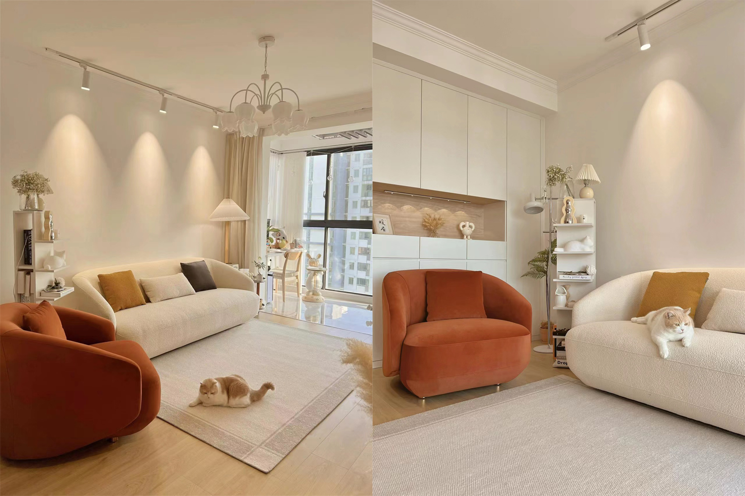 活力焦糖、百搭米白,一款双色的配置,可以满足不同群体的喜好。A款熔岩焦糖偏红绒布,抗起球高弹力,可以完美贴合沙发轮廓,营造出简洁的高级感;B款圈圈纱风格面料,拥有很强的肌理感,立体蓬松,摆放在客厅,时尚度瞬时提升。外观造型上,【WO】采用了有弧度的柔和线条,不同于常规的方方正正的沙发,它是相对异形的,看起来饱满圆润,可以给家居空间带来更多的活力。