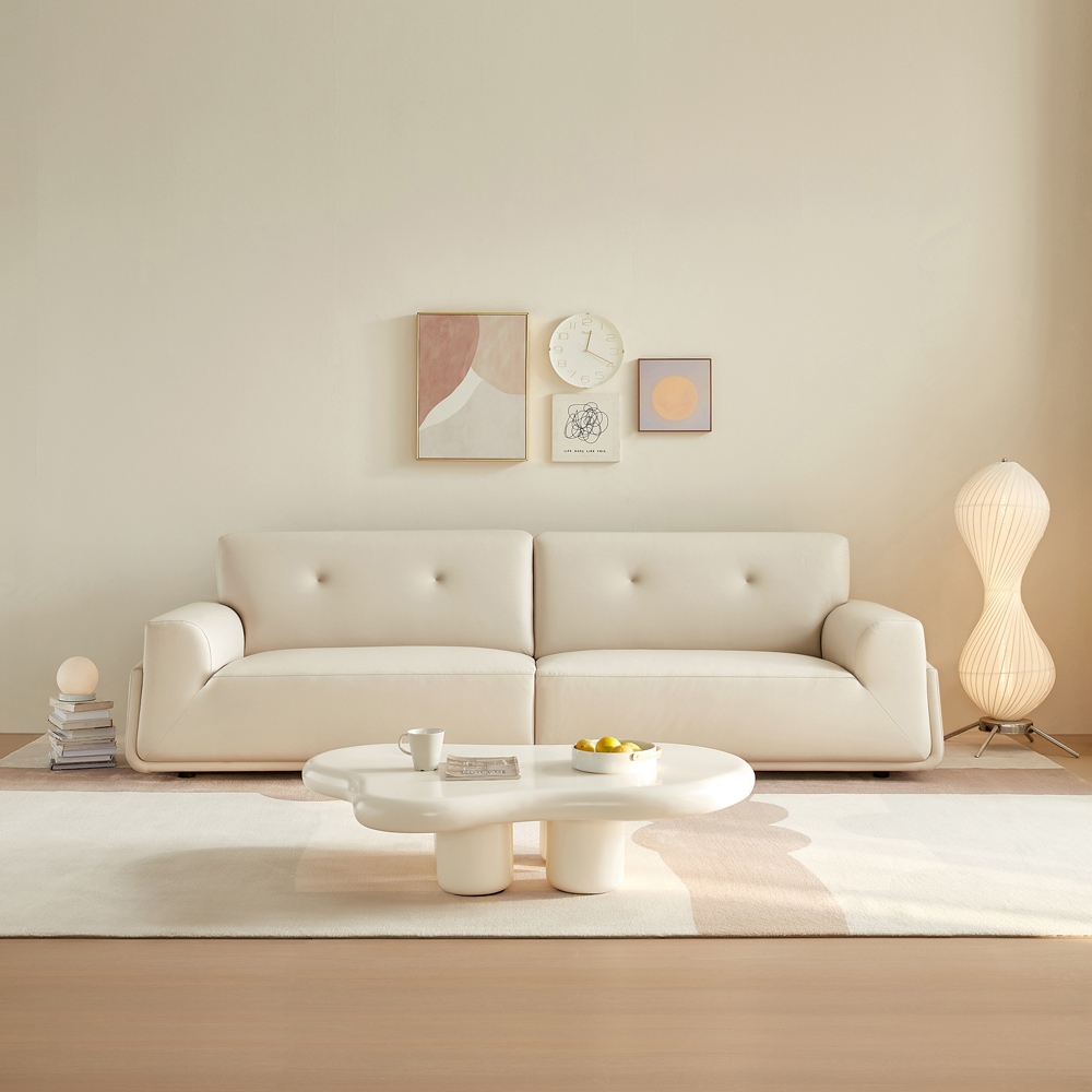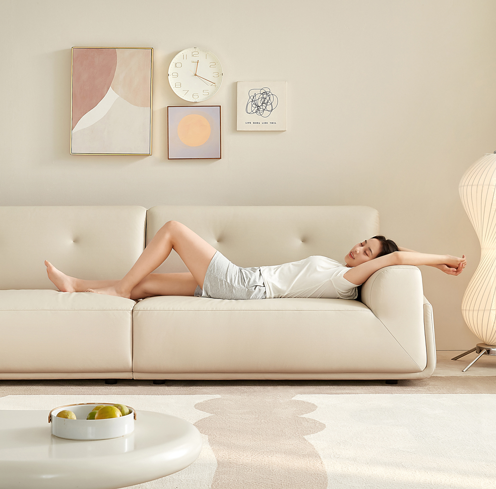 设计师赋予了绵岛外柔内刚的定义。“绵”象征着舒适、绵软,恒压高弹海绵填充让绵岛有了包裹性极强的软弹坐感;“岛”则寓意着坚固、稳定的安全感,恰似绵岛方正的外观、稳固的框架。沙发280cm加大一字型设计+63cm加大坐深,坐躺更自如,双层扶手设计,外层结实、内层柔软,还可作为枕头使用。