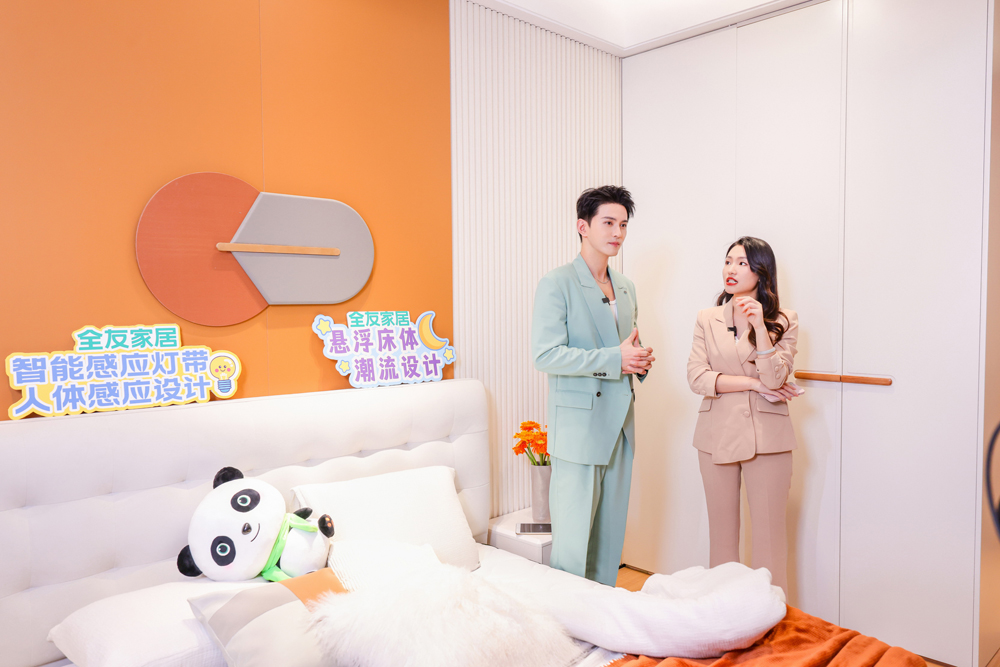 智能悬浮软床,床身周围配置了磁吸式智能感应灯带,人体感应,靠近即亮,夜间起夜再也不用摸黑。试躺软床时,徐正溪也帮大家观察到,床体灯带是隐蔽式设计,床脚也是隐藏的,充满细节的人性化设计让他连连称赞。体验完猫抓绒布新品,徐正溪还给大家种草了抑菌防螨的床垫和时尚组合茶几。