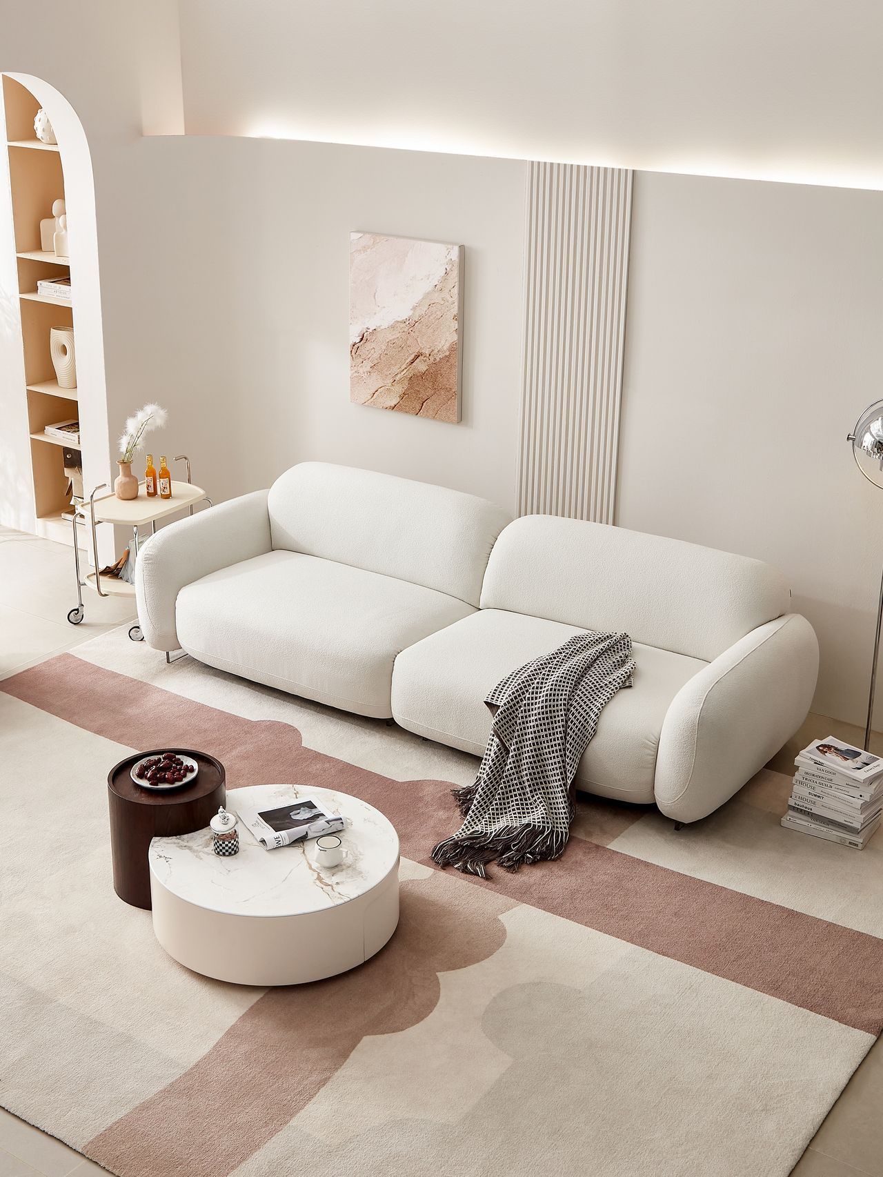 奥云沙发设计灵感源自Oort Clouds·奥尔特星云,沙发外形如球状星轨,圆润饱满。亚克力沙发脚晶莹剔透,搭配柔光灯带,打造悬浮效果。沙发表面的圈圈纱材质,自带颗粒触感,饱满厚实、亲肤透气。高弹海绵饱满填充,回弹性优越,仿佛陷入星云般柔软。68cm加宽坐深,全身舒展,自在躺卧。