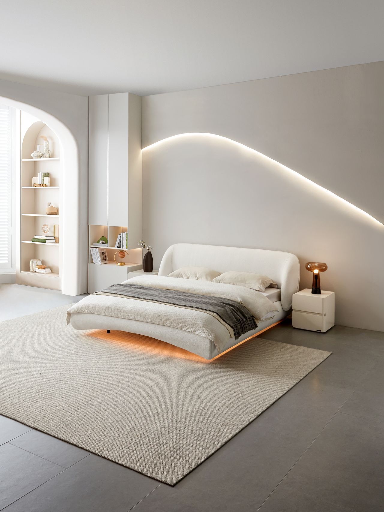 巴斯软床以巴斯彗星为设计灵感,外观采用标志性的彗星尾设计,新颖别致。悬浮设计搭配智能感应灯带,营造星际太空的光影氛围,一眼望去如腾空悬浮。深空灰磨砂绒布耐磨透气,分体式大靠包内填微孔式弹棉,蓬松弹软、轻松躺靠,释放压力。