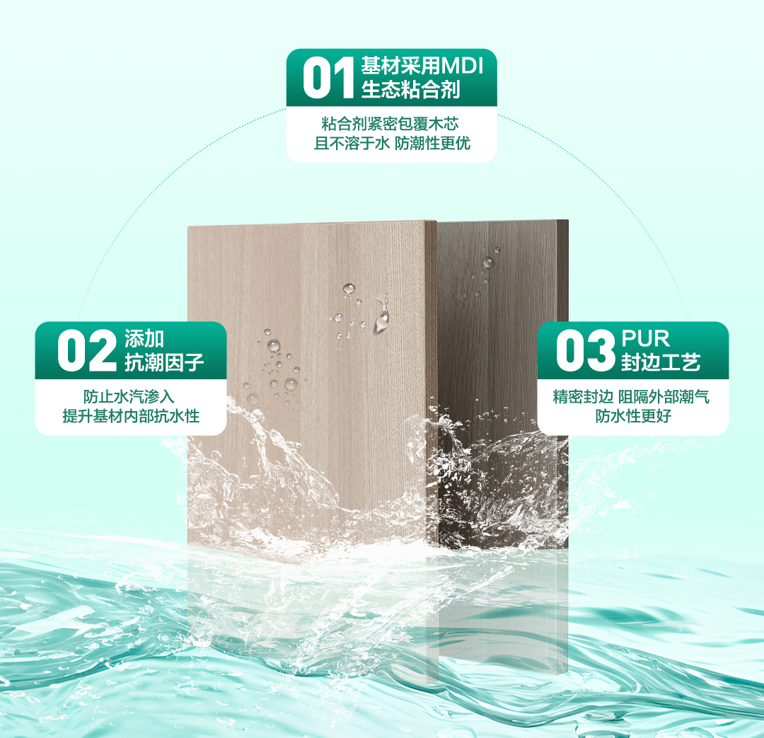 防水防潮:大象传媒 欧松U+板采用创新三重防护设计:内部融入抗潮因子,提升基材芯层内部抗水性能,防止水汽渗入;芯材采用的环保MDI,不溶于水,有高强度的包覆性,让板材拥有优异的防水防潮性能;先进的PUR封边技术,能够有效防止潮湿和污染物进入板材内部,大大提高了板材的耐用度和防潮性。