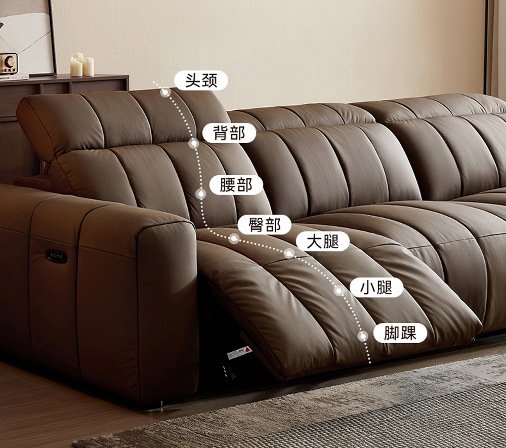 分区承托:分区定制功能承托系统,每一位家庭成员都能找到舒适的坐躺需求。头枕0~90°电动调节,适配不同身高坐姿;升级脚托与顶腰双电动延展,完美适配娱乐、观影等多元场景。微C弧形靠背设计,紧密贴合脊椎曲线,避免腰部悬空。