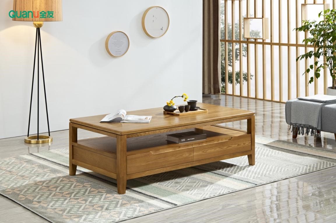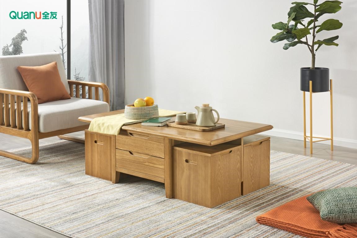 1几4凳的茶几设计,让家具的功能发挥到了极致。除了中间的储物抽屉,两侧还有可移动的储物凳,空间大,能收纳客厅杂物,人多时还能轻松拉出作为凳子。