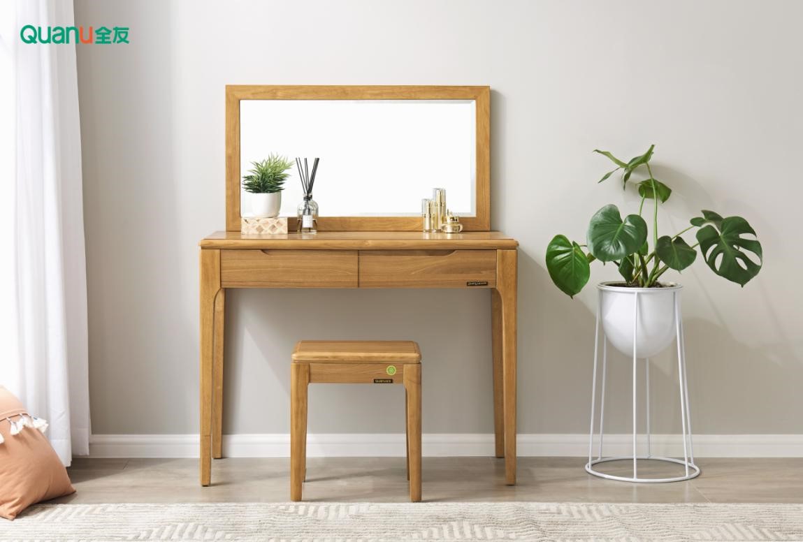 承担多个角色的梳妆台,也非常独特。内置多宝格可以收纳各类饰品、化妆品,展开就是化妆台,放下则立刻变身为一个简洁书桌。
