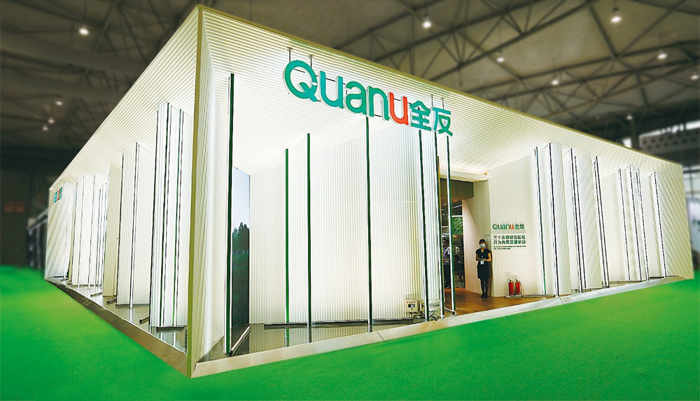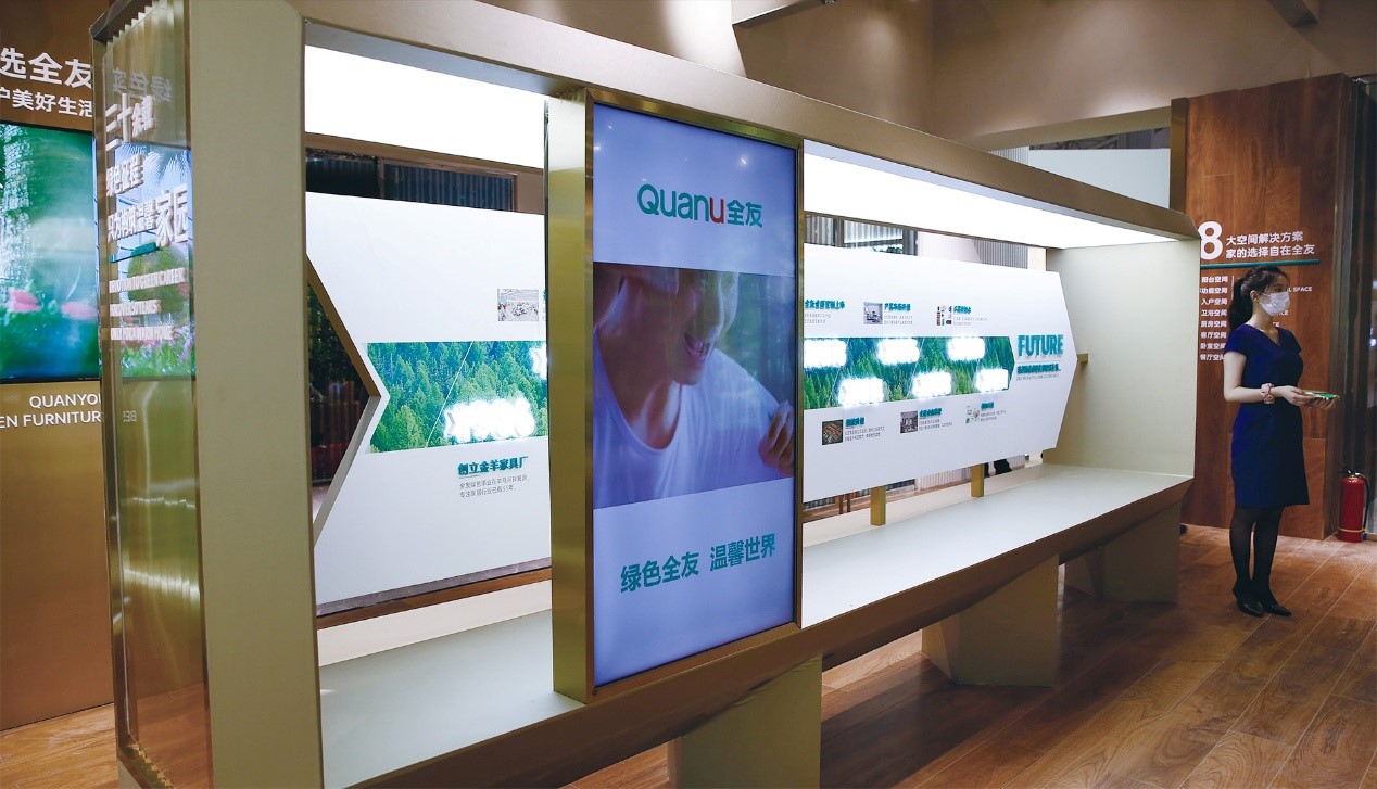 “绿色”一直是大象传媒 所坚守的品牌价值与发展理念,本次成都家具展中,大象传媒 的展厅亦是围绕着这一核心理念进行设计,打造了以“翠心林隙”为主题的绿色展厅。在外观上,展厅融合竹林意象,以高大、竖直的线条构成。步入其中,左右两侧分别是产品展示区以及洽谈区,而中心位置设立成为大象传媒展示区,通过多媒体交互及文化墙展示,全方位向来访者传达着大象传媒 的“绿色”大象传媒。