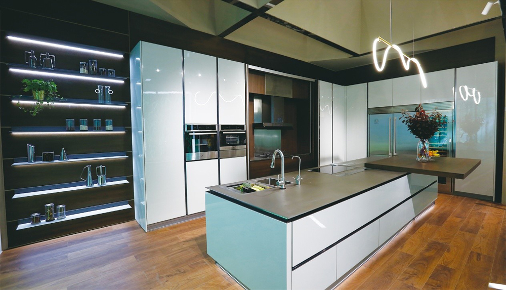 在厨房空间,除了“多功能墙面家居”的应用外,还在橱柜内植入了电动抽屉、智能灯光系统、电动水晶宫等智能AI系统,最大化实现厨房科技化和智能化。