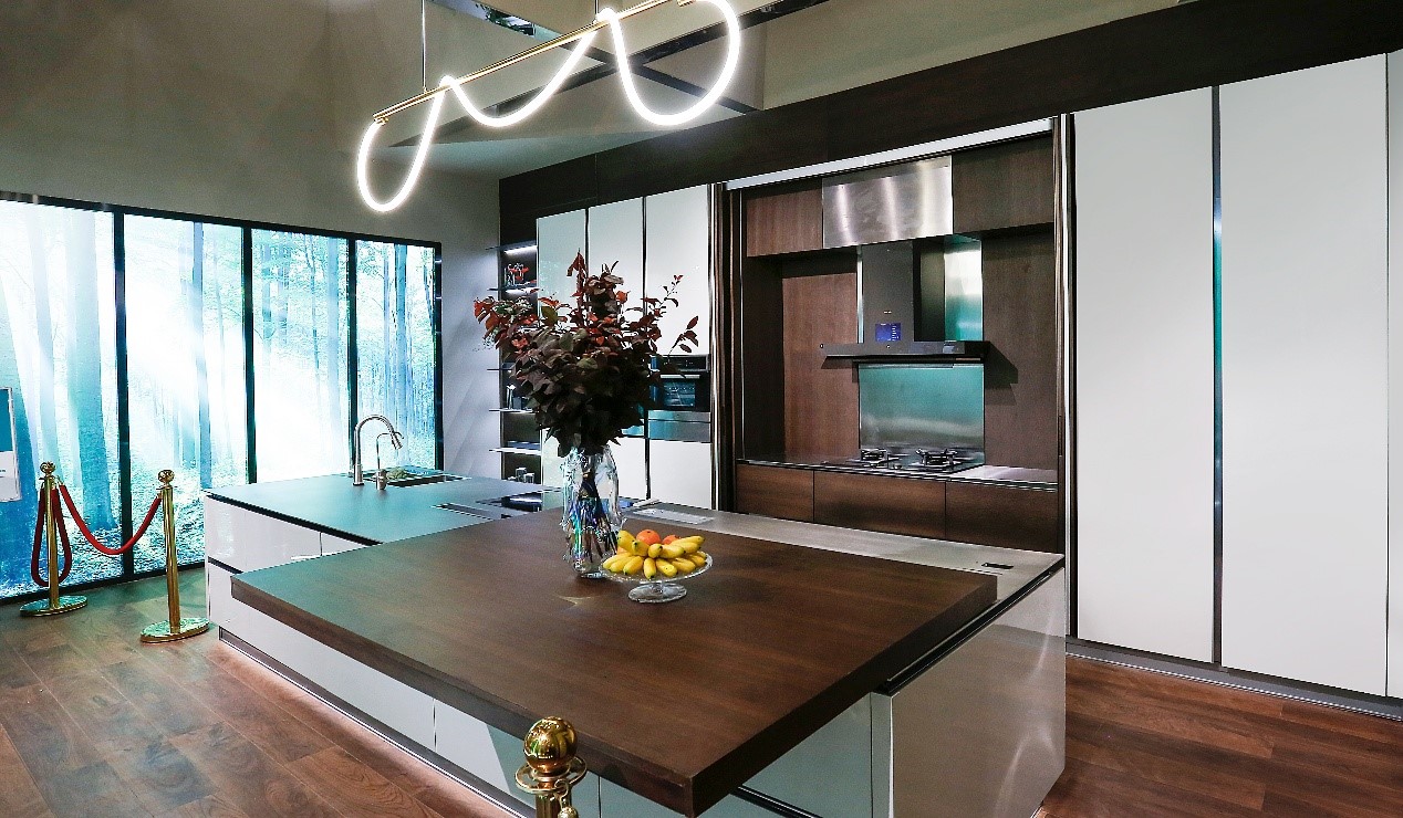 而“拉菲诺3”系列定制橱柜则是以亮光烤漆搭配烟熏木色,沉稳大气,科学规划了L型转角橱柜+中岛的动线布局,将中厨功能和西厨设计进行了完美结合,既能满足国人的煎炒习惯,又能满足西餐爱好者的烹饪需求。