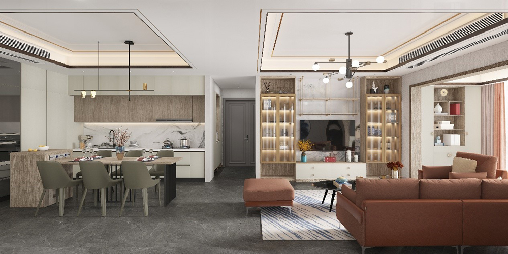 “简意+”系列以自然的深木色为主色调,搭配高级灰皮革及浅灰玻璃门,在简单低调中透露出不一样的轻奢质感。