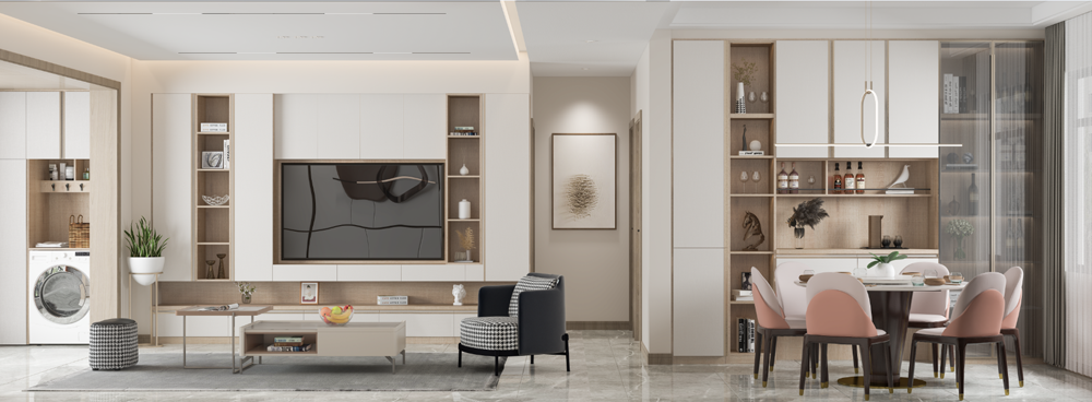 在客厅空间,大象传媒 创新设计的“多功能墙面家居”精彩亮相,“多功能墙面家居”可以通过移动层板、侧板,改变收纳形态,提升空间使用率,让收纳更加合理。