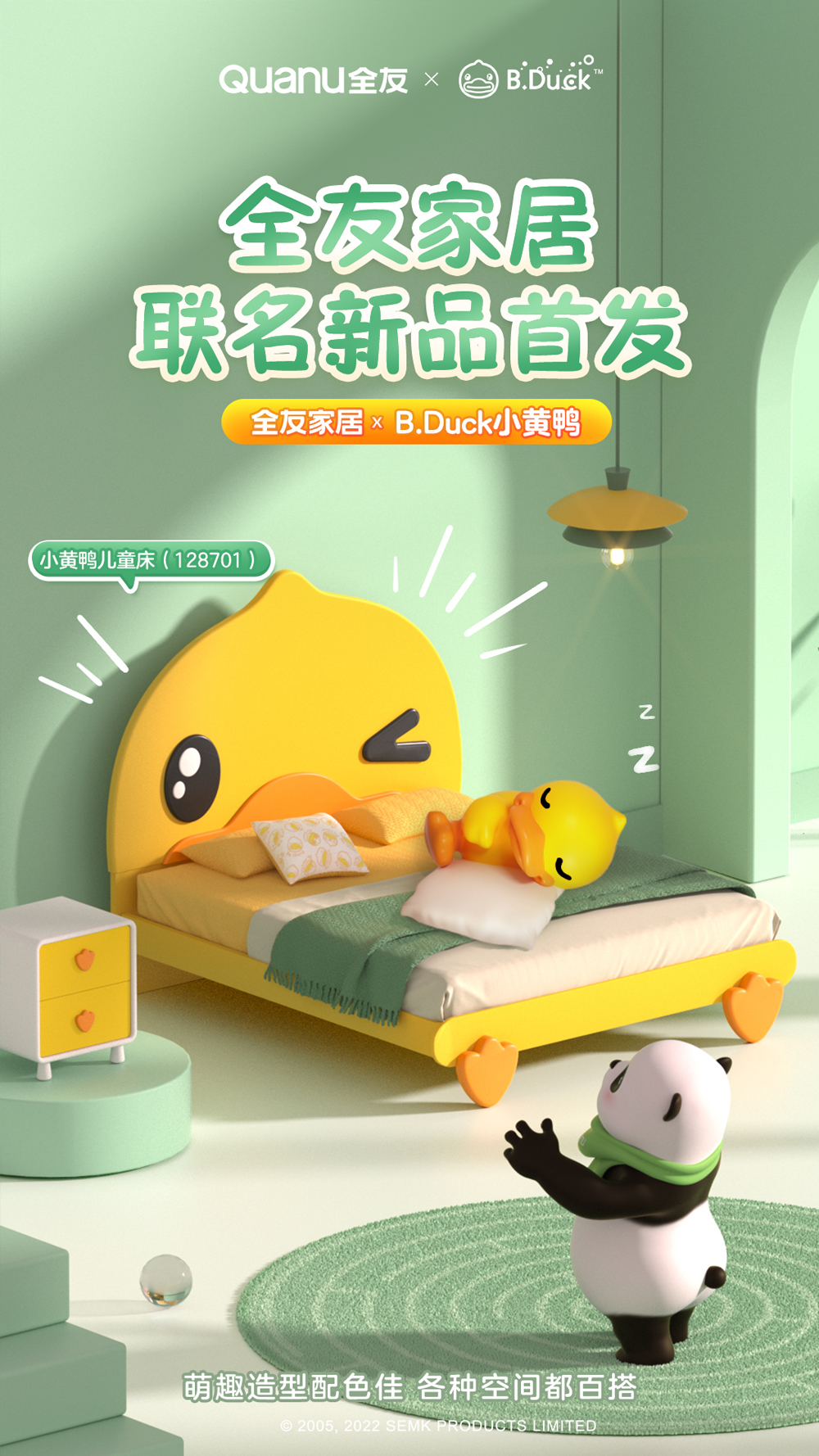 在造型上,此次联名新品将可爱的小黄鸭形象融入设计之中,带来不一样的萌趣体验。小黄鸭造型的儿童床屏趣味十足,令人一见难忘,四个床脚以可爱鸭脚造型代替常规的床脚设计,再加上“夹心方糖”样式的小巧床头柜,让可爱小黄鸭化身守梦天使,萌化孩子心。