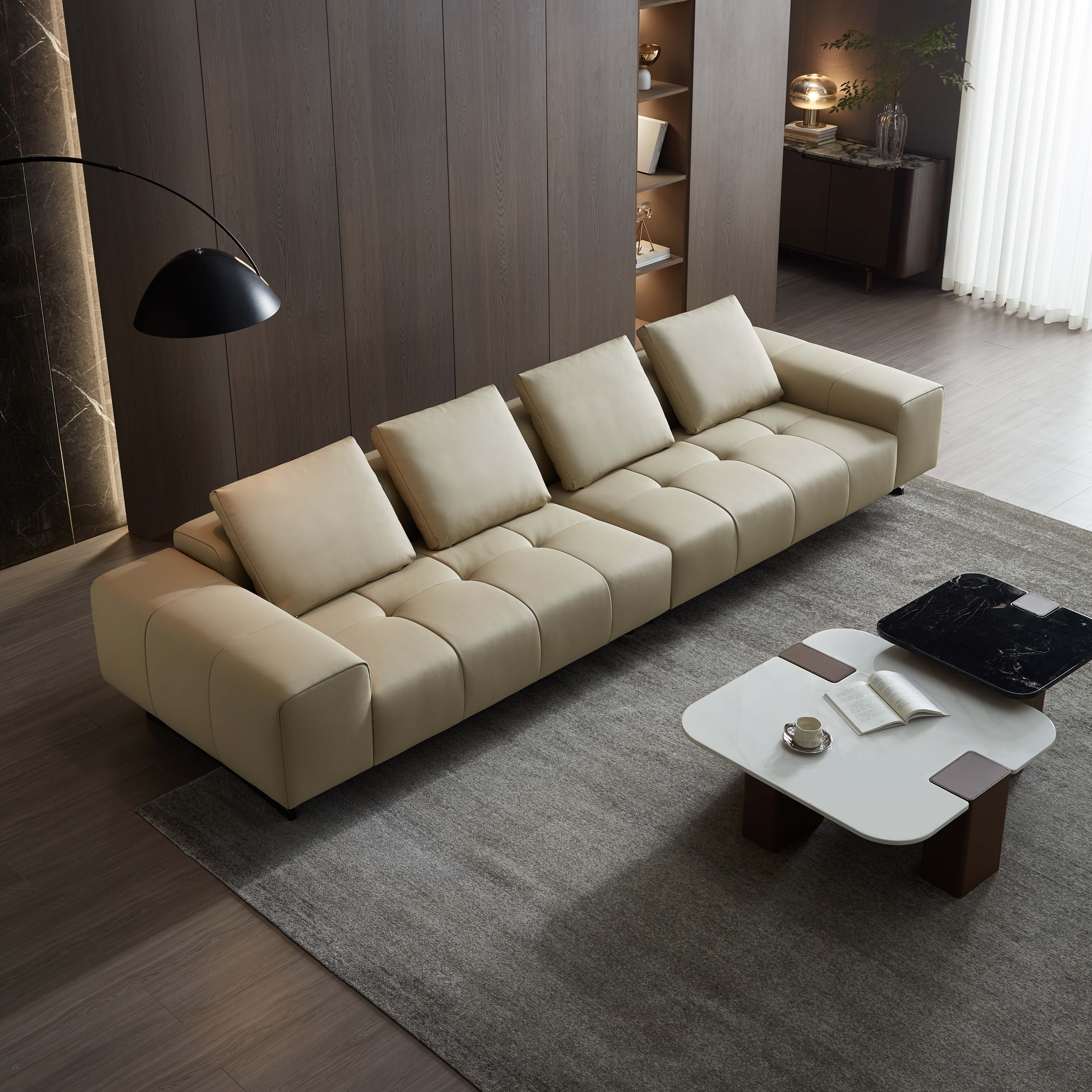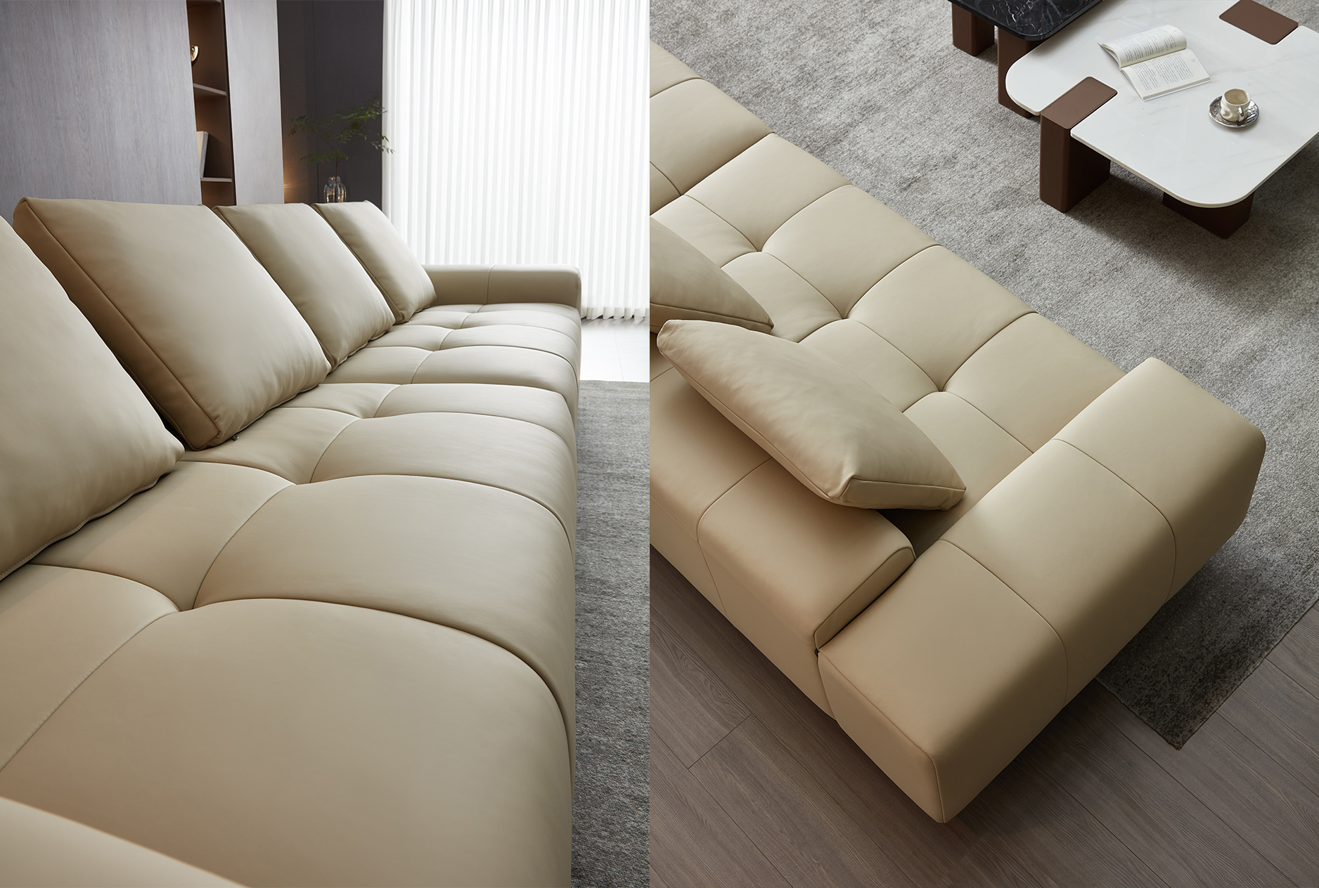 家庭影院沙发采用意式极简设计,线条利落考究,钢琴键座包以几何秩序呈现现代美学;3.62m大气对称造型,专为大宅、横厅定制,营造简奢氛围。全部位面料甄选藏品级纳帕皮,高级平纹自带奢感,触感细腻温润,皮质厚实柔软,强韧抗撕拉,透气舒爽,久用如新。