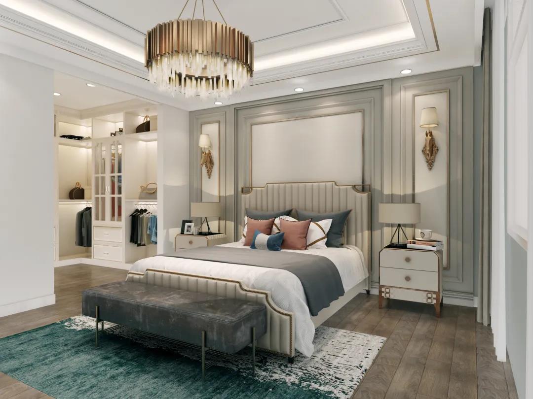 床头软包是一种常用的床头背景装饰,它的材料柔软,能够柔化整体空间氛围,其纵深的立体感亦能提升空间档次。