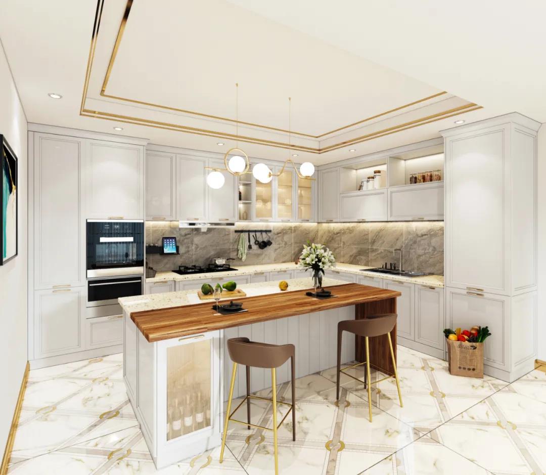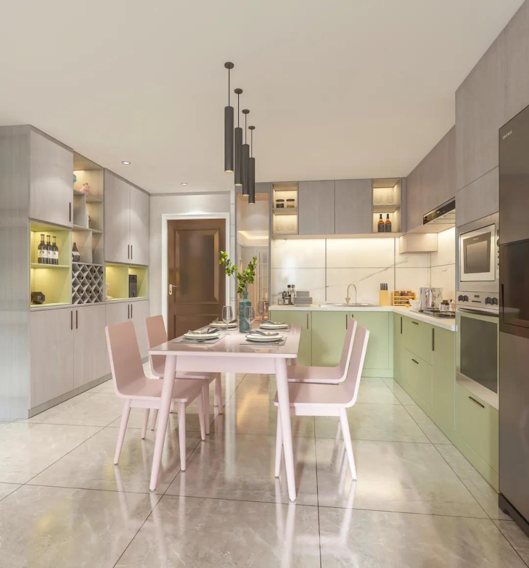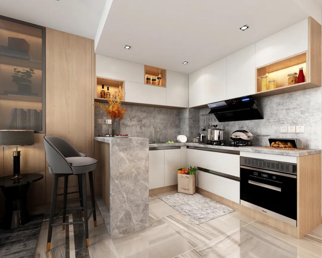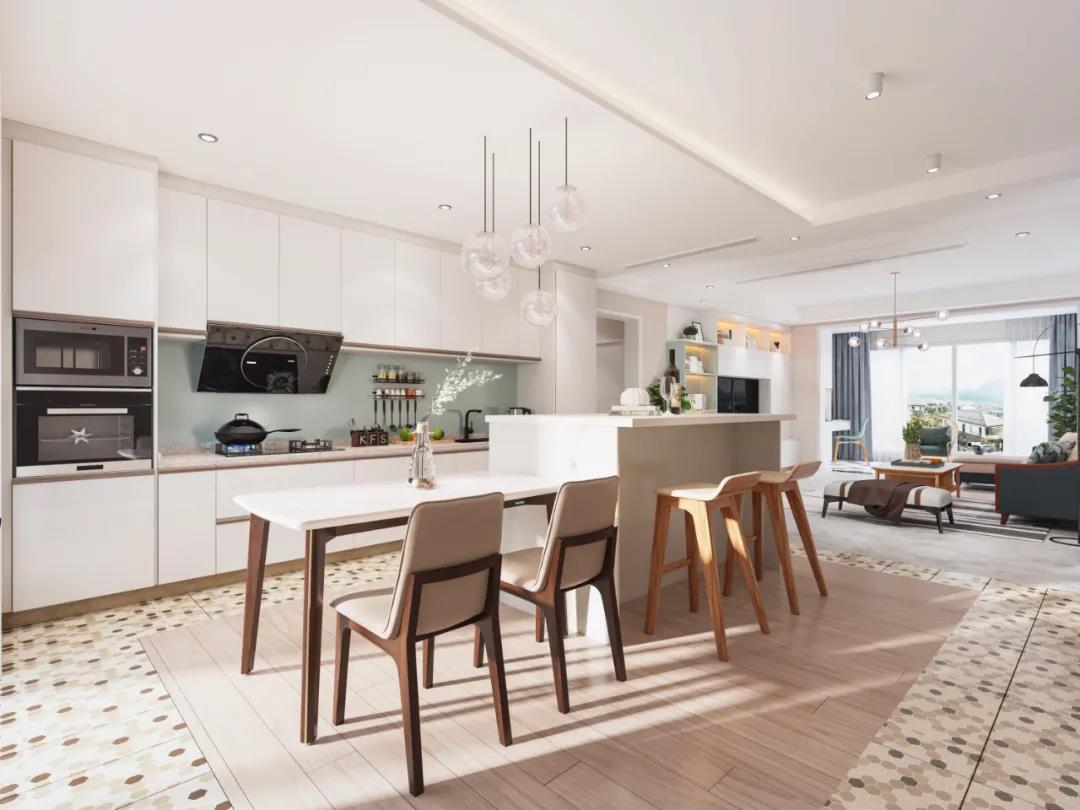 社交型厨房通常是开放性设计,并且多以加入岛台来方便日常生活,让人群更容易地聚集起来,有利于面对面交流。 合理规划烹饪和用餐动线,将“洗—切—煮—用餐”的路径优化到最短,并且最大化留出活动空间,方便家人、朋友交流互动。 中岛台的加入,不仅为厨房增加一处备餐区,还为家人提供了一处可交流互动的区域。 中岛台下方可以做收纳柜,设计成抽屉或玻璃掩门式等,收纳厨具和日常的杂物;放上高脚凳,还可以做吧台、工作台使用,可一边做饭一边闲聊,轻松又惬意。