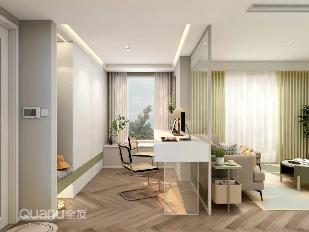 地台隔断是一种立体式隔断设计,只需将台面进行抬高,就可以很好地将两个空间的区域进行区分。再结合玻璃设计,既保留了原有的通透感,两个功能区又更具有独立性。