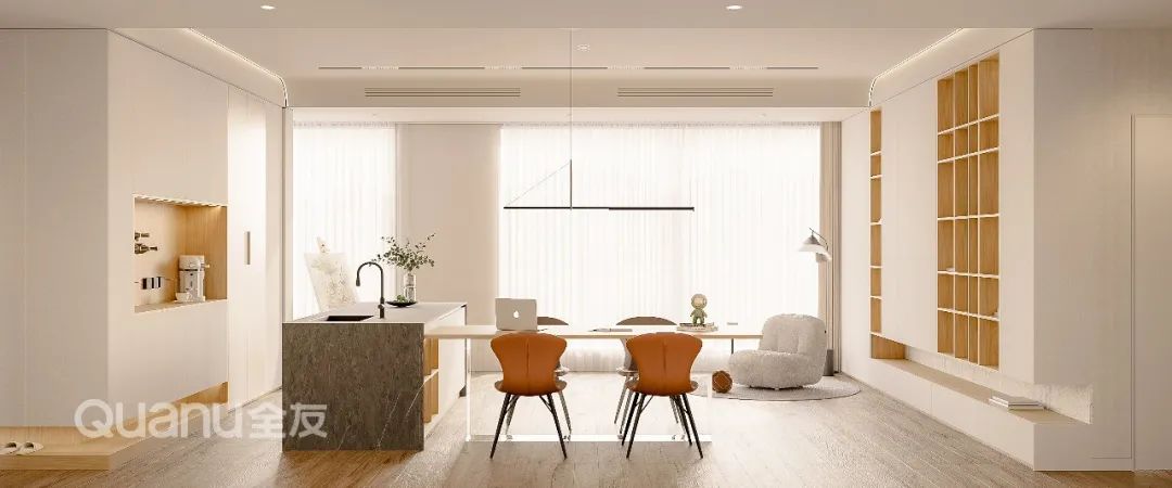 现在的年轻人大多没有看电视的需求,除了将电视柜改造为整墙储物柜以外,还可以把“沙发+茶几”的组合改为“岛台+长桌”。这样设计不仅可以满足烘焙的乐趣,偶有社交需求也不用担心没有待客的地方,喜欢喝茶的人,还可以将长桌作为茶桌使用,客厅功能更加多元,实用性更强。