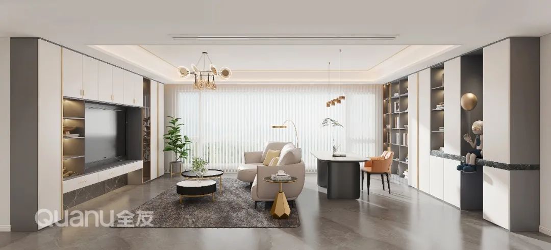当居家办公成为了常态化的工作模式,家里就不得不多设计一个工作区。我们可以保留客厅的基本属性,靠墙定制整墙书柜,摆放书桌椅,让客厅兼顾书房功能。